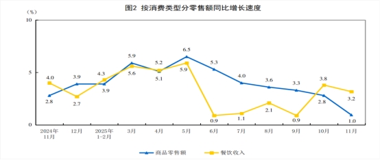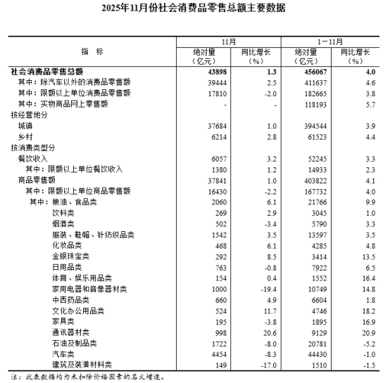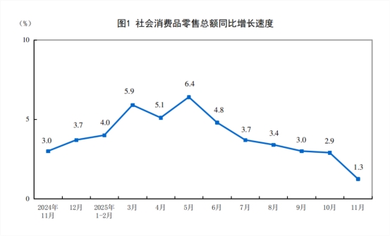 2025年11月份社會(huì)消費(fèi)品零售總額增長(zhǎng)1.3%