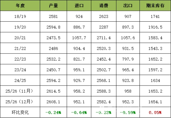 25/26年度主要的棉花主產(chǎn)國的產(chǎn)量以豐產(chǎn)或高產(chǎn)為主,全球需求總體表現(xiàn)一般,因此全球供給仍偏寬松。受產(chǎn)量增加、消費量下降影響,最終期末庫存處于近6個年度平均值下方,整體壓力不大。綜合來看,本次報告指引有限,市場反應平淡。