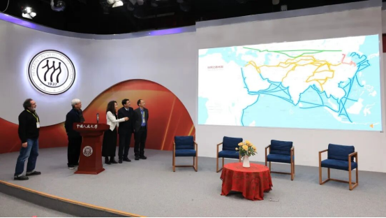李沁教授與主旨報(bào)告的三位專家及李啟正總編輯共同登臺(tái),攜手啟動(dòng)這份研究倡議。隨著五位嘉賓依次按下啟動(dòng)按鈕,大屏幕上,五條分屬陸上與海上的絲綢之路光影脈絡(luò)依次被點(diǎn)亮,或橫貫大陸,或縱越滄海,古今交融的璀璨線條展開了一幅超越地理與文化的絲路文明長(zhǎng)卷。