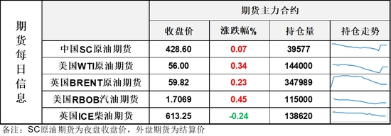 【1】WTI主力原油期貨收漲0.19美元,漲幅0.34%,報56美元/桶;布倫特主力原油期貨收漲0.14美元,漲幅0.23%,報59.82美元/桶;INE原油期貨收漲0.07%,報428.6元。