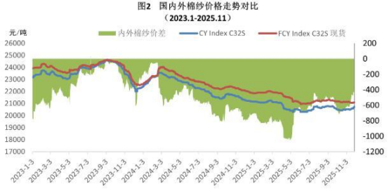 本月棉花市場反彈帶動國內(nèi)棉紗價格暫時企穩(wěn),但整體市場未有顯著改善,終端需求偏弱與庫存壓力對漲幅造成壓制,短期市場仍將維持震蕩偏穩(wěn)運行。進口棉紗價格維持跌勢,雖然有溯源訂單支撐,但下游接受度不高,實際成交優(yōu)惠力度較大。國產(chǎn)32支純棉紗11月均價為20564元/噸,環(huán)比上漲94元/噸,增幅0.5%,同比下跌931元/噸,跌幅4.3%;進口32支純棉紗月均價為21097元/噸,環(huán)比下跌33元/噸,跌幅0.2%,同比下跌1090元/噸,跌幅4.9%。
