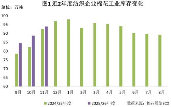 11月新棉大量上市,紡織企業(yè)前期預(yù)采購棉花到庫,加上部分剛需補庫,原料庫存有所上升。截至11月底紡織企業(yè)在庫棉花工業(yè)庫存量為94萬噸,較上月底增加5.1萬噸。紡織企業(yè)可支配棉花庫存量為110.6萬噸,較上月底增加4萬噸。其中:41%的企業(yè)增加棉花庫存,28%減少,31%基本保持不變。