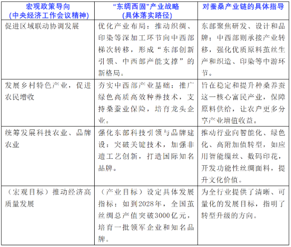 具體來看,國家層面的產(chǎn)業(yè)戰(zhàn)略(如“東綢西固”)可以看作是中央經(jīng)濟(jì)工作會議精神在蠶桑領(lǐng)域的具體實踐和延伸。宏觀政策與產(chǎn)業(yè)發(fā)展戰(zhàn)略的對應(yīng)關(guān)系具體體現(xiàn)在如下幾方面: