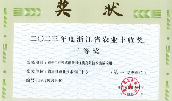 通過(guò)院企合作,試驗(yàn)篩選繁育系數(shù)高、農(nóng)村好養(yǎng)高產(chǎn)、繭絲性能優(yōu)良的家蠶新品種“農(nóng)科5號(hào)”“水星1號(hào)”“中2016×日2016”推廣飼養(yǎng)。通過(guò)自主創(chuàng)新,集成優(yōu)良特色蠶品種繁育、種繭育高產(chǎn)桑園栽培、小蠶規(guī)模共育、大蠶省力化飼養(yǎng),開展桑園土壤病原菌及其微生態(tài)調(diào)查,研究微粒子病防控技術(shù)在蠶種繁育中的應(yīng)用,推進(jìn)了良種良法優(yōu)質(zhì)高效技術(shù)的示范。2021年以來(lái),主持發(fā)布市、縣相關(guān)地方標(biāo)準(zhǔn)2個(gè),主持發(fā)明專利和實(shí)用新型專利獲授權(quán)3項(xiàng),主持“蠶種生產(chǎn)模式創(chuàng)新與優(yōu)質(zhì)高效技術(shù)集成應(yīng)用”項(xiàng)目獲2023年度浙江省農(nóng)業(yè)豐收三等獎(jiǎng)。德清蠶種產(chǎn)業(yè)的持續(xù)創(chuàng)新,為蠶種“一帶一路”出口提供了技術(shù)支撐。