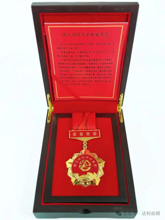 浙江省優(yōu)秀企業(yè)家評選旨在表彰 “創(chuàng)新驅(qū)動,突破瓶頸,打造浙江發(fā)展新引擎” 的企業(yè)帶頭人,張金珍在數(shù)十年的從業(yè)生涯中,身體力行,始終以實際行動一步一個腳印踐行著這些標準 。為新時代絲綢行業(yè)高質(zhì)量發(fā)展提供了新的發(fā)展模式和樣板。這次張總被評為第二十四屆浙江省優(yōu)秀企業(yè)家光榮稱號,既是對張總個人成績的肯定更是達利絲綢全體員工的光榮。