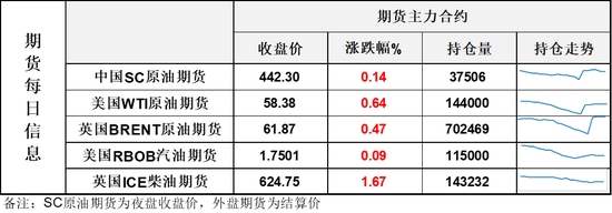 【1】WTI主力原油期貨收漲0.37美元,漲幅0.64%,報58.38美元/桶;布倫特主力原油期貨收漲0.29美元,漲幅0.47%,報61.87美元/桶;INE原油期貨收漲0.14%,報442.3元。
