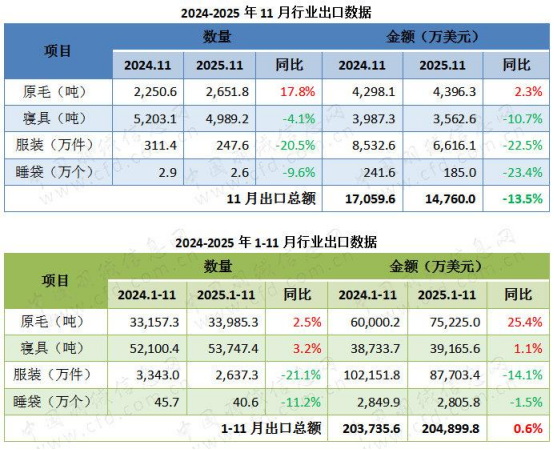 1-11月羽絨行業(yè)累計出口總額為20.5億美元,同比微增0.6%,整體保持平穩(wěn)。分品類看:原毛出口額大幅增長25.4%,表現(xiàn)突出;寢具出口相對穩(wěn)定,數(shù)量和金額略微增長;服裝出口延續(xù)疲軟態(tài)勢,數(shù)量和金額分別下滑21.1%和14.1%。