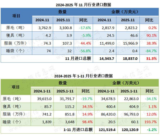 綜合1-11月,行業(yè)進口總額約12.0億美元,同比下降1.2%。其中,原毛進口量值齊跌,服裝進口量值均有所上漲。