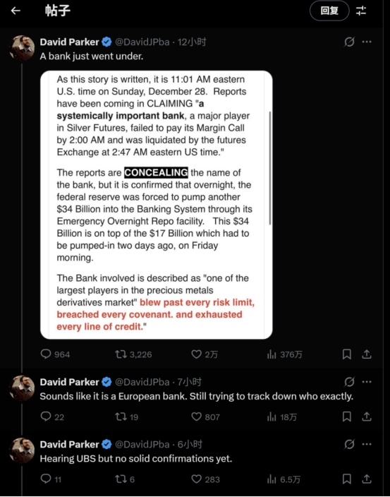現(xiàn)貨白銀經(jīng)歷過(guò)山車(chē)行情之際,社交平臺(tái)X上的一則傳聞引爆了輿論。有用戶轉(zhuǎn)發(fā)某博客文章稱,一家在白銀期貨市場(chǎng)持有大量空頭頭寸的“系統(tǒng)重要性銀行”,因未能支付追加保證金,已于美國(guó)東部時(shí)間周日凌晨被強(qiáng)制平倉(cāng)和接管。