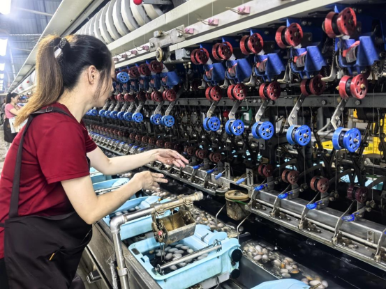 車間里,工人們各司其職,有條不紊地操作著各種機(jī)器設(shè)備。一顆顆小小的蠶繭,在他們的手中經(jīng)過選繭、煮繭、繅絲、復(fù)搖、整理等多道工序,變成了一根根綿細(xì)的生絲。這些生絲潔白如雪,質(zhì)地柔軟,散發(fā)著淡淡的光澤。隨后,生絲又被送往不同的生產(chǎn)線上,經(jīng)過編織等工藝,最終生產(chǎn)出了高品質(zhì)的白廠絲、蠶絲被等產(chǎn)品,走向全國(guó)各地的市場(chǎng)。