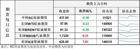 【1】WTI主力原油期貨收跌0.13美元,跌幅0.22%,報57.95美元/桶;布倫特主力原油期貨收跌0.16美元,跌幅0.26%,報61.33美元/桶;INE原油期貨收跌0.36%,報437元。