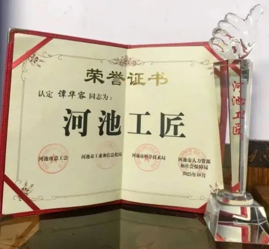 “河池工匠”評(píng)選旨在表彰技藝超群、敬業(yè)奉獻(xiàn)的優(yōu)秀技能人才。譚華容憑借其精湛的專業(yè)技能和在崗位上的卓越貢獻(xiàn)脫穎而出。作為公司的技術(shù)骨干,他長(zhǎng)期深耕生產(chǎn)技術(shù)一線,以精益求精的態(tài)度攻克多項(xiàng)技術(shù)難題,是公認(rèn)的技能楷模。