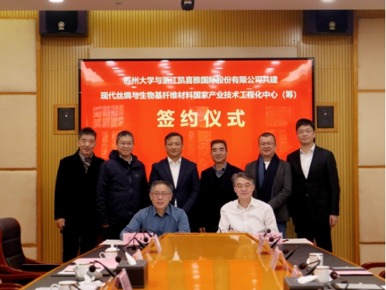 12月22日,蘇州大學(xué)與凱喜雅集團(tuán)簽署協(xié)議,共建現(xiàn)代絲綢與生物基纖維材料國(guó)家產(chǎn)業(yè)技術(shù)工程化中心(籌)。蘇州大學(xué)黨委常委、副校長(zhǎng)張正彪,凱喜雅集團(tuán)執(zhí)行聯(lián)席總裁劉光芒,聯(lián)席總裁、深圳華絲生物科技有限公司董事長(zhǎng)沈明宏,科學(xué)技術(shù)研究院副院長(zhǎng)孟慶權(quán),紡織與服裝工程學(xué)院黨委書記肖甫青等出席,會(huì)議由紡織與服裝工程學(xué)院院長(zhǎng)張克勤主持。