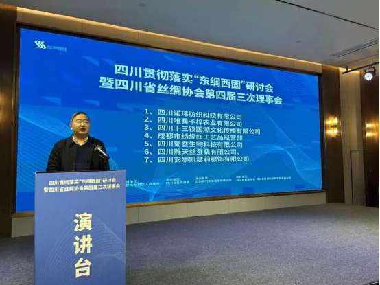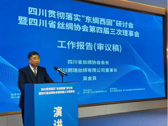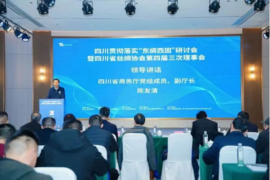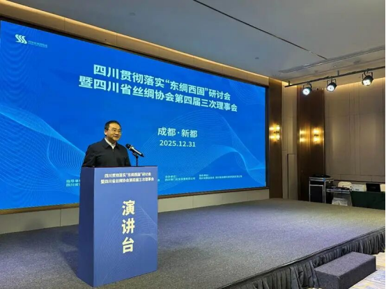 2025年12月31日,四川貫徹落實(shí)“東綢西固”研討會(huì)暨四川省絲綢協(xié)會(huì)第四屆三次理事會(huì)在成都新都區(qū)成功召開(kāi)。會(huì)議由四川省商務(wù)廳指導(dǎo),成都市新都區(qū)人民政府支持,四川省絲綢協(xié)會(huì)主辦,四川省錦門實(shí)業(yè)發(fā)展有限公司承辦,四川省蠶業(yè)協(xié)會(huì)、四川省絲綢科學(xué)研究院有限公司協(xié)辦。來(lái)自省經(jīng)濟(jì)和信息化廳、省蠶業(yè)管理總站、市州蠶業(yè)產(chǎn)業(yè)發(fā)展中心、蠶種場(chǎng)、行業(yè)高校院所、質(zhì)量檢測(cè)、海關(guān)外貿(mào)、文化旅游等部門及省內(nèi)80余家會(huì)員單位共200余人齊聚一堂,研討落實(shí)商務(wù)部“東綢西固”工作,審議理事會(huì)工作報(bào)告及提案,總結(jié)交流行業(yè)發(fā)展情況,研究部署明年工作重點(diǎn),共商四川絲綢產(chǎn)業(yè)在新形勢(shì)下的發(fā)展路徑。省商務(wù)廳黨組成員副廳長(zhǎng)陳友清出席會(huì)議并講話,四川省經(jīng)濟(jì)和信息化廳輕工紡織處副處長(zhǎng)、二級(jí)調(diào)研員劉偉、成都市新都區(qū)人民政府黨組成員、副區(qū)長(zhǎng)胡藍(lán)分別為大會(huì)致辭。中國(guó)絲綢協(xié)會(huì)副會(huì)長(zhǎng)、四川省絲綢協(xié)會(huì)會(huì)長(zhǎng)、四川朗瑞絲綢有限公司董事長(zhǎng)吳金良代表本屆理事會(huì)向大會(huì)作2025年工作報(bào)告,中國(guó)絲綢協(xié)會(huì)副會(huì)長(zhǎng)、四川省絲綢協(xié)會(huì)副會(huì)長(zhǎng)、四川省絲綢科學(xué)研究院黨委書(shū)記、董事長(zhǎng)程明作提案報(bào)告。四川省蠶業(yè)管理總站站長(zhǎng)王彥紅,協(xié)會(huì)副會(huì)長(zhǎng)單位、四川省農(nóng)業(yè)科學(xué)院蠶業(yè)研究所黨委委員、副所長(zhǎng)黃蓋群,中國(guó)絲綢協(xié)會(huì)副會(huì)長(zhǎng)、四川省絲綢協(xié)會(huì)副會(huì)長(zhǎng)、寧南縣南絲路集團(tuán)黨委書(shū)記、董事長(zhǎng)林平,中國(guó)絲綢協(xié)會(huì)副會(huì)長(zhǎng)、四川省絲綢協(xié)會(huì)副會(huì)長(zhǎng)、四川安泰繭絲綢集團(tuán)董事長(zhǎng)唐定云,四川省絲綢科學(xué)研究院黨委委員、董事、副總經(jīng)理鄭丹,四川南充六合(集團(tuán))有限責(zé)任公司總經(jīng)理明剛分別作交流發(fā)言。會(huì)議由四川省絲綢協(xié)會(huì)秘書(shū)長(zhǎng)、四川省絲綢科學(xué)研究院黨委副書(shū)記唐仕成主持。
