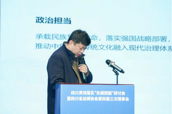 在專題交流發(fā)言環(huán)節(jié),多位行業(yè)專家與領(lǐng)軍企業(yè)代表聚焦“東綢西固”戰(zhàn)略落地與產(chǎn)業(yè)高質(zhì)量發(fā)展,分別從不同維度提出了具有前瞻性和實(shí)踐性的發(fā)展思路。王彥紅重點(diǎn)介紹了2025年全省蠶桑產(chǎn)業(yè)情況;黃蓋群系統(tǒng)闡述了加快構(gòu)建四川蠶?,F(xiàn)代產(chǎn)業(yè)技術(shù)體系、科技助力國(guó)家“東綢西固”戰(zhàn)略;林平圍繞落實(shí)“建圈強(qiáng)鏈”戰(zhàn)略,分享了打造千億級(jí)蠶桑產(chǎn)業(yè)鏈的南絲路方案;唐定云結(jié)合產(chǎn)業(yè)轉(zhuǎn)移升級(jí),分享了以珙縣項(xiàng)目為支點(diǎn),如何答好“發(fā)揮新質(zhì)生產(chǎn)力、落實(shí)東綢西固戰(zhàn)略、推動(dòng)行業(yè)高質(zhì)量發(fā)展”這一時(shí)代命題的安泰經(jīng)驗(yàn);鄭丹深入剖析了“十五五”時(shí)期行業(yè)科技與產(chǎn)業(yè)創(chuàng)新深度融合的方向與實(shí)施路徑;四川南充六合集團(tuán)明剛則介紹了“百年六合”推動(dòng)絲綢文化和旅游產(chǎn)業(yè)融合發(fā)展的創(chuàng)新模式與經(jīng)驗(yàn)。通過(guò)本次交流與研討,從宏觀戰(zhàn)略思考到具體項(xiàng)目布局,對(duì)四川絲綢貫徹落實(shí)“東綢西固”各項(xiàng)任務(wù)、加速傳統(tǒng)產(chǎn)業(yè)轉(zhuǎn)型升級(jí)與區(qū)域協(xié)同發(fā)展等具有積極促進(jìn)作用和現(xiàn)實(shí)意義。