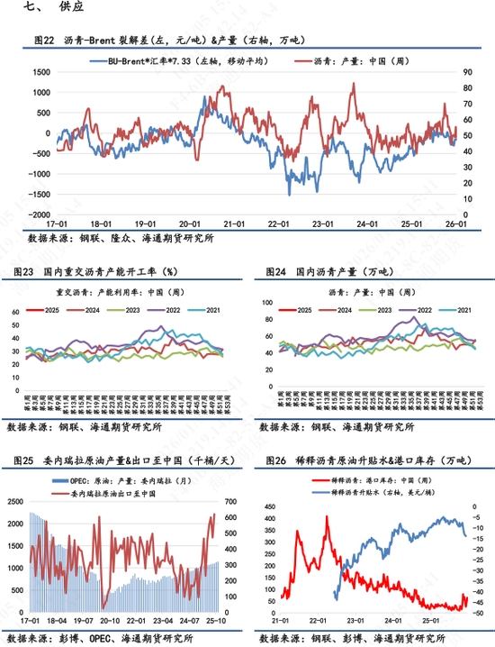 【4】基本面變化:新年第一個(gè)交易日,瀝青罕見(jiàn)出現(xiàn)大幅缺口跳漲,主要受周末委內(nèi)瑞拉事件影響。委內(nèi)瑞拉馬瑞16號(hào)原油(稀釋瀝青品牌)生產(chǎn)瀝青是國(guó)內(nèi)地?zé)捵顬榍嗖A的油種,主要由于其既適配大量不具備深度加氫裂化能力的裝置,又具有相比主流原油具有高貼水,產(chǎn)出高瀝青收率有利于鋪設(shè)道路。2024年煉廠使用馬瑞原油生產(chǎn)瀝青占比超過(guò)50%。一旦委油出口斷供,意味著國(guó)內(nèi)最主要、最經(jīng)濟(jì)的瀝青原料供應(yīng)將受斷裂,煉廠被迫轉(zhuǎn)向更昂貴的替代原料,如中東沙特/巴士拉重油、加拿大冷湖原油、馬來(lái)西亞冷混原油、俄羅斯烏拉爾油等,將承擔(dān)更高的運(yùn)輸成本、品質(zhì)成本、裝置調(diào)整成本等,而這也直接推高瀝青的生產(chǎn)費(fèi)用,尤為是對(duì)那些沒(méi)有原油進(jìn)口配額的煉廠。盡管可從新加坡、韓國(guó)進(jìn)口成品瀝青,但其進(jìn)口成本高于提煉原料生產(chǎn)。