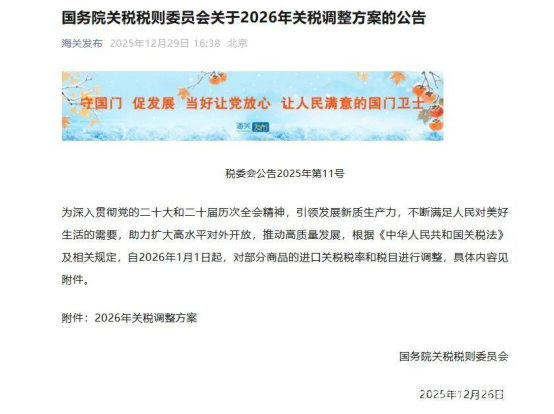 2025 年 12 月 29 日,海關(guān)總署正式對外發(fā)布消息,國務(wù)院關(guān)稅稅則委員會印發(fā)《2026 年關(guān)稅調(diào)整方案》(以下簡稱《方案》),明確自 2026 年 1 月 1 日起實(shí)施一系列關(guān)稅調(diào)整措施。