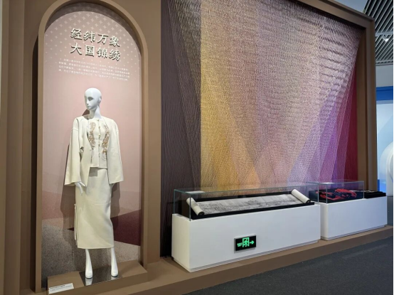 在這場展覽中,來自盛澤的蘇州上久楷絲綢科技文化有限公司驚艷亮相,成為區(qū)域產(chǎn)業(yè)高質(zhì)量發(fā)展的亮眼名片。企業(yè)以“經(jīng)緯萬象、大國錦繡”為核心主題,集中展示宋錦這項(xiàng)千年非遺瑰寶在守正創(chuàng)新與科技賦能下的活化發(fā)展成果,通過經(jīng)緯絲線藝術(shù)裝置、宋錦雙面大方巾、蘇州運(yùn)河十景圖、創(chuàng)新性面料組、雙層羊絨色織宋錦服裝等特色展品,重點(diǎn)突破工藝傳承、面料創(chuàng)新與產(chǎn)品應(yīng)用三大核心領(lǐng)域,生動詮釋宋錦在當(dāng)代續(xù)寫“錦繡生活”的嶄新篇章。