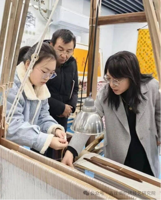 交流環(huán)節(jié)中,王燕教授與丁國強老師對研究院在傳統絲綢文化傳承與創(chuàng)新方面的豐碩成果給予高度評價,他們表示,此次參觀不僅深度領略了中華絲綢文化的深厚底蘊,更真切看到了年輕一代傳承非遺技藝的飽滿熱情與責任擔當。大家圍繞“傳統織造技藝與高校藝術設計教育融合路徑”“美育課程中絲綢文化的植入策略”等議題展開深入探討,雙方均期待未來能搭建長效合作平臺,推動傳統絲綢文化在新時代煥發(fā)蓬勃生機。
