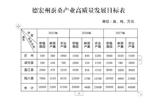 在云南德宏州,《蠶桑產(chǎn)業(yè)高質(zhì)量發(fā)展三年行動(dòng)方案(2025—2027年)》中,積極強(qiáng)化政策支持,聚力特色興農(nóng),持續(xù)推動(dòng)德宏州蠶桑產(chǎn)業(yè)高質(zhì)量可持續(xù)發(fā)展,促進(jìn)產(chǎn)業(yè)增效、農(nóng)戶增收,助推鄉(xiāng)村振興。(表格來自于德宏人民政府網(wǎng)站)