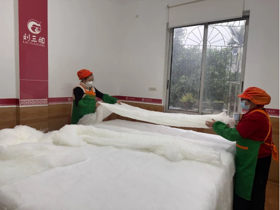 近日,在廣西嘉聯(lián)絲綢股份有限公司、廣西劉三姐家居文化有限公司的生產(chǎn)車間里,蠶絲被制作工作正有條不紊地推進(jìn)。經(jīng)過多道預(yù)處理的桑蠶長絲瑩白柔軟,工人們分工協(xié)作,完成手工拉制、定點(diǎn)縫制、壓邊縫合等工序,再經(jīng)嚴(yán)格質(zhì)檢后裝入芯套,一床床兼具品質(zhì)與溫度的蠶絲被便新鮮出爐?!啊止だ啤@一步,全憑手上的功夫。這蠶絲必須要一層層拉得很蓬松,這樣蓋在身上才暖和,這就是咱們宜州蠶絲被‘貼身保暖’的秘訣?!眲⑷慵揖游幕邢薰竟と藯钆拷榻B道。