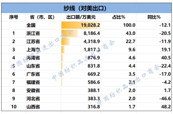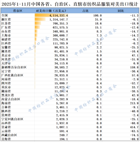 2025年1-11月,我國(guó)紡織服裝累計(jì)對(duì)美出口411.43億美元,同比下降11.3%。浙江省、江蘇省、廣東省、山東省、上海分別列全國(guó)紡織服裝對(duì)美出口省市前五位,合計(jì)比重超八成。