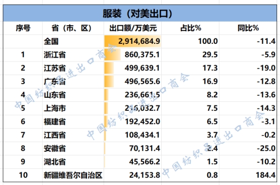 2025年1-11月我國(guó)紡織服裝重點(diǎn)省市對(duì)美出口概況