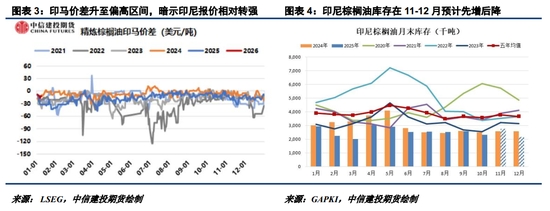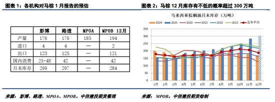 盡管如此,且馬棕10-12月產量同比增幅擴大仍是隱憂,隨著季節(jié)性減產推進及1月中下旬印度齋月備貨啟動,我們預計馬棕12月庫存見頂的可能性較高,今年1季度有望進入去庫狀態(tài),馬棕1月高頻產需數據已顯示一定邊際利多。下周一的MPOB月報后,棕櫚油價格可能再度迎來利空出盡,預計P05在8300附近的支撐將較強。
