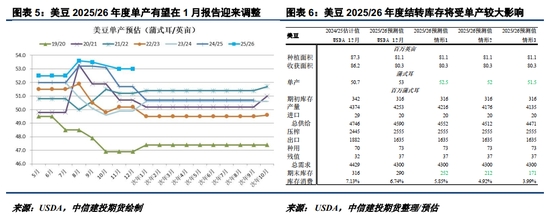 美國政府的停擺令USDA錯失10月報告,停擺結束后的11月報告因缺乏完整數據對單產調整謹慎,而12月報告則依慣例未調整平衡表,令美豆2025/26年度單產預估仍維持53蒲式耳/英畝高位,尚未反應美豆產區(qū)8月偏差降雨對單產的不利影響。在此背景下,USDA 1月的定產報告如何調整單產預估將十分關鍵,因其將決定直到10月報告前的美豆2025/26年度產量形勢及供需狀況。市場平均預估USDA將小幅調降2025/26年度美豆單產預估至52.7,對比2024/25年度的天氣及50.7的單產,該預期似乎有些高,這令單產超預期調降的可能性增加。