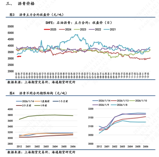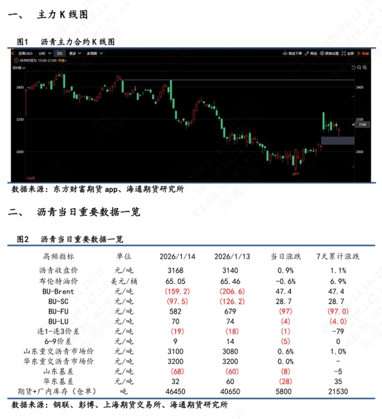 【1】盤面表現(xiàn):BU 2603主力合約日內(nèi)高位震蕩,最終收盤價3168,較昨日收盤價+0.88%,盤中最高觸及3190,最低3151。按收盤價算近7天累計+1.1%。次月合約2606較昨日收盤價+0.60%。近月漲幅高于遠(yuǎn)月合約。