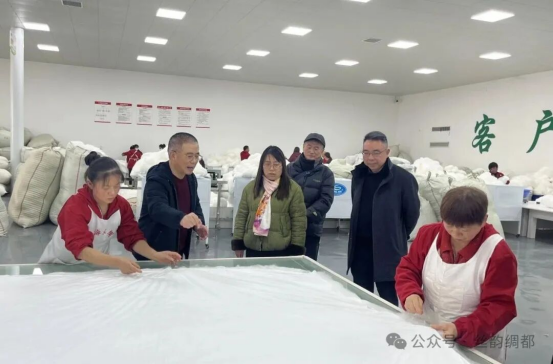 南充銀海絲綢有限公司成立于2006年,是一家集蠶桑養(yǎng)殖、蠶絲被生產銷售、貿易于一體的綜合性企業(yè),2024年企業(yè)年產值達1億元。作為四川省農產品加工示范企業(yè)、中國蠶絲被研發(fā)基地,該企業(yè)還參與了國家《蠶絲綿》《蠶絲被》行業(yè)標準的起草修訂工作,在絲綢行業(yè)擁有重要技術引領作用與市場標桿地位。在銀海絲綢總經理何國君的陪同下,調研團隊先后參觀了企業(yè)精煉車間和中國蠶絲被之鄉(xiāng)文化館,實地觀摩了蠶絲被制作工藝流程。調研過程中,雙方圍繞絲綢產業(yè)非物質文化遺產申報、文化傳承與企業(yè)品牌傳播等關鍵議題,展開深度交流。