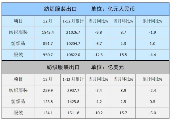 單月數(shù)據(jù)方面,12月紡織服裝出口1842.4億元,同比下降9.8%,但環(huán)比實(shí)現(xiàn)8.7%的增長(zhǎng)。其中,紡織品出口891.7億元,同比下降6.7%、環(huán)比增長(zhǎng)2.3%;服裝出口950.7億元,同比下降12.5%、環(huán)比增長(zhǎng)15.5%,環(huán)比增速顯著高于紡織品。