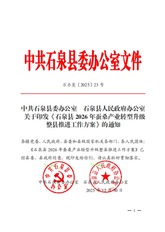 為全面貫徹全縣蠶桑產(chǎn)業(yè)鏈高質(zhì)量發(fā)展部署,加快推進全縣蠶桑產(chǎn)業(yè)轉(zhuǎn)型升級與高質(zhì)量發(fā)展,近日,石泉縣委辦公室、縣政府辦公室正式印發(fā)了《石泉縣2026年蠶桑產(chǎn)業(yè)轉(zhuǎn)型升級整縣推進工作方案》。該《方案》旨在系統(tǒng)推進全縣蠶桑產(chǎn)業(yè)向集約化、智能化、市場化深度轉(zhuǎn)型,為將石泉全力打造成全省區(qū)域性蠶桑產(chǎn)業(yè)集群核心區(qū),全國優(yōu)質(zhì)蠶繭生產(chǎn)和 6A 級生絲加工基地繪制了清晰的“施工圖”。