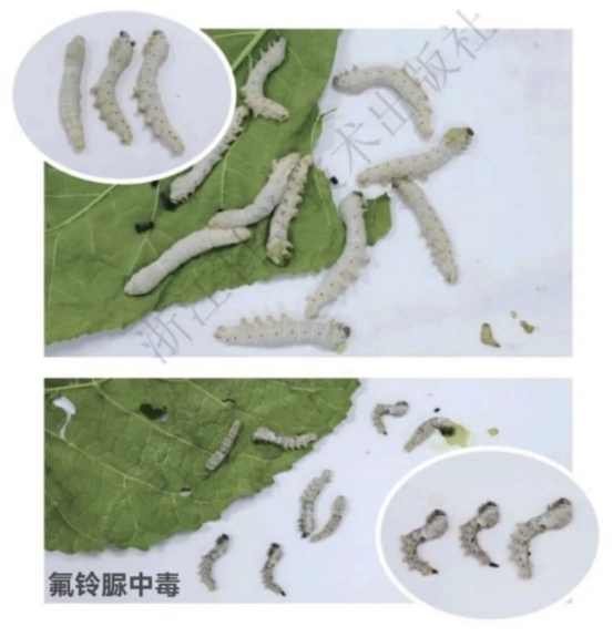 氟鈴脲導(dǎo)致桑蠶急性中毒癥狀為不吃、不動、不吐液,1天后蠶體僵直、側(cè)倒,觸之能動,有假死現(xiàn)象;慢性中毒則食桑不旺,不亂爬、不搖頭、不吐液,蠶體瘦小,表皮僵硬,部分蠶皮膚破裂。多數(shù)蠶入眠推遲,個別蠶不能蛻皮,發(fā)育開差拉大,群體發(fā)育不齊。