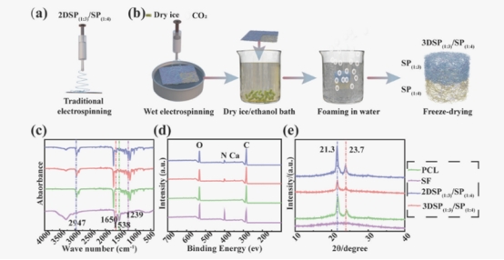 將SF/PCL按1:3和1:4比例溶解于六氟異丙醇,通過濕法靜電紡絲(參數(shù):16kV電壓,0.5ml/h流速,75%乙醇收集)先后沉積形成雙層膜。隨后在CO2飽和乙醇中浸泡發(fā)泡,轉(zhuǎn)入水中促使CO2逸出形成3D結(jié)構(gòu),凍干后對成骨層進(jìn)行10%明膠涂層。