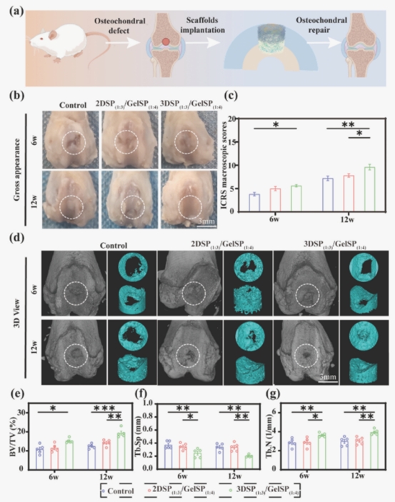 大鼠實驗顯示,12周后3D支架組缺損修復(fù)最完整,ICRS評分最高(8.1±0.3)。組織染色顯示3D組形成透明樣軟骨,與宿主組織整合良好;Micro-CT定量分析顯示其骨體積分?jǐn)?shù)(BV/TV=19.31%)、骨小梁數(shù)量(Tb.N=4.0/mm)均顯著優(yōu)于對照組。免疫組化證實3D組COL-II和OCN沉積最豐富。