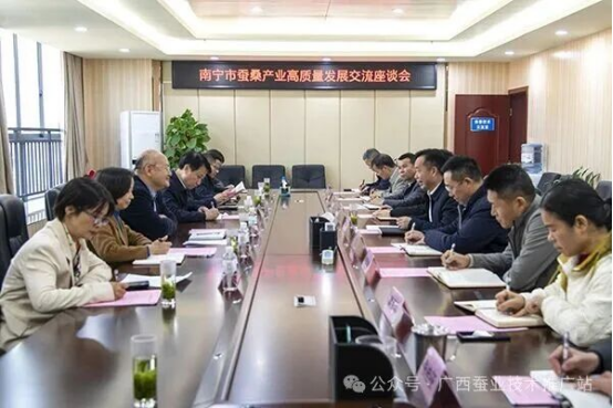 穆賢清一行先后參觀了人工飼料養(yǎng)蠶研發(fā)中心、桑樹種質(zhì)資源圃、果桑農(nóng)旅融合高效發(fā)展新模式示范大棚、廣西蠶桑遺傳改良與高效種養(yǎng)重點實驗室及科研成果展示館,對蠶桑科技創(chuàng)新成果進行調(diào)研,隨后與廣西蠶業(yè)技術(shù)推廣站領(lǐng)導(dǎo)班子及相關(guān)科室負(fù)責(zé)人進行座談。座談會上,雙方就提高蠶桑生產(chǎn)水平與技術(shù)推廣效能、推動南寧市蠶桑產(chǎn)業(yè)提質(zhì)增效等方面內(nèi)容開展深入交流,重點就蠶桑優(yōu)良品種選育、高效養(yǎng)殖模式創(chuàng)新、產(chǎn)業(yè)鏈條延伸等內(nèi)容進行探討,為下一步開展相關(guān)工作、助力南寧市蠶桑產(chǎn)業(yè)高質(zhì)量發(fā)展凝聚共識。