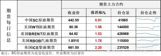 【1】WTI主力原油期貨收漲0.93美元,漲幅1.56%,報(bào)60.36美元/桶;布倫特主力原油期貨收漲0.98美元,漲幅1.53%,報(bào)64.92美元/桶;INE原油期貨收漲0.91%,報(bào)442.5元。