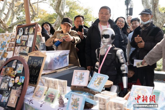 浙江杭州,人形機器人“小楊”在西湖畔的市集銷售崗位亮相