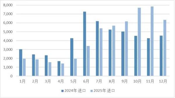2025年,羊絨原料及制品進(jìn)口呈現(xiàn)“前低后高”的明顯走勢(shì),與2024年“年中高位”的節(jié)奏形成鮮明對(duì)比,反映市場(chǎng)需求周期的變化特征。