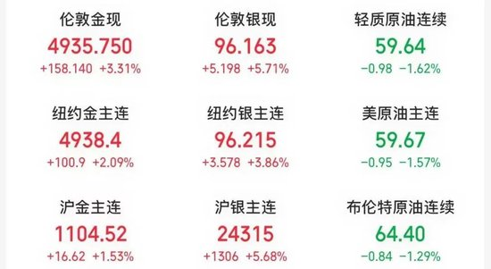 貴金屬方面,倫敦金現(xiàn)貨價格收漲3.31%,報4935.75美元/盎司;倫敦銀現(xiàn)貨價格大漲近6%。滬金、滬銀主力合約也大幅上漲。