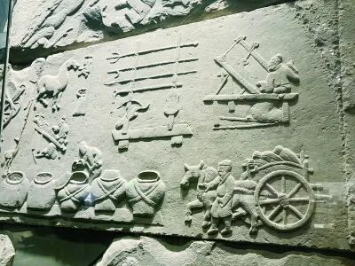兵器架旁,兩名女子端坐于織機(jī)兩側(cè),神情專注,十指翻飛。她們身后立著柱子與食槽,遠(yuǎn)處馬匹奔走、猴群嬉戲,旁邊還有人正在忙碌地釀酒……這一幅生動的莊園生產(chǎn)生活場景,正是成都博物館中陳列于織機(jī)旁的漢代畫像石所呈現(xiàn)的畫面。它不僅是漢代蜀地紡織生產(chǎn)的縮影,也能從中得以窺見蜀錦締造者的身影。