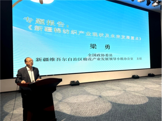 專題報(bào)告環(huán)節(jié),全國(guó)政協(xié)委員、新疆維吾爾自治區(qū)棉花產(chǎn)業(yè)發(fā)展領(lǐng)導(dǎo)小組辦公室主任梁勇介紹了2025年新疆棉紡織產(chǎn)業(yè)發(fā)展現(xiàn)狀,并根據(jù)自治區(qū)正在編制的中長(zhǎng)期發(fā)展規(guī)劃,介紹了未來(lái)新疆紡織服裝產(chǎn)業(yè)的發(fā)展重點(diǎn)。梁勇首先介紹了新疆棉花產(chǎn)量及紡織原料結(jié)構(gòu)的變化情況;立足資源稟賦,未來(lái)新疆紡織服裝產(chǎn)業(yè)發(fā)展重點(diǎn)將突出“高端化、智能化、綠色化”,并加快構(gòu)建具有新疆特色和競(jìng)爭(zhēng)優(yōu)勢(shì)的現(xiàn)代化紡織產(chǎn)業(yè)體系。