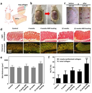圖4c顯示了SSSTs植入SD大鼠前后標(biāo)記之間距離的變化,指示了植入部位。SSSTs植入前后標(biāo)記之間的距離從3.0cm縮短到2.7cm,即縮短了10%。植入后即刻收縮效果顯著。對(duì)植入部分的組織進(jìn)行Masson三色染色、血管內(nèi)皮生長(zhǎng)因子(VEGF)染色和組織學(xué)分析。植入后第12周,SSSTs周圍組織中的膠原蛋白含量顯著增加。這些結(jié)果為SSST在皮膚張力調(diào)節(jié)中的應(yīng)用提供了強(qiáng)有力的證據(jù)。圖4e顯示膠原蛋白含量和皮膚密度都隨著植入后時(shí)間的延長(zhǎng)而增加。SSSTs的植入導(dǎo)致新膠原蛋白的產(chǎn)生,近紅外光加熱進(jìn)一步促進(jìn)了新膠原蛋白的生產(chǎn)。