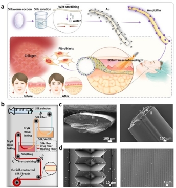 SSSTs植入皮膚組織后,吸收皮膚組織下的血液或組織液以實(shí)現(xiàn)收縮,從而影響和收緊部分皮下筋膜,直接提拉松散的皮膚組織。SSSTs在收縮后會(huì)導(dǎo)致部分機(jī)械刺激,刺激成纖維細(xì)胞產(chǎn)生新的膠原纖維,從而實(shí)現(xiàn)膠原重塑、皮膚組織重排和中長(zhǎng)期穩(wěn)定提皮效果。參考射頻(RF)技術(shù)在美容醫(yī)學(xué)領(lǐng)域的應(yīng)用原理,SSSTs的近紅外光加熱功能是利用金納米棒材料的光熱轉(zhuǎn)換性能設(shè)計(jì)并實(shí)現(xiàn)的。利用絲素蛋白的易功能化能力,將氨芐西林鈉負(fù)載在SSSTs上,實(shí)現(xiàn)SSSTs的緩慢藥物釋放和抗菌功能,達(dá)到抑制細(xì)菌和減少術(shù)后炎癥反應(yīng)的目的。圖1b顯示了SSSTs的制備過(guò)程。通過(guò)濕伸展操作實(shí)現(xiàn)自收縮功能。近紅外激光加熱和抗菌功能通過(guò)摻雜和表面涂層操作實(shí)現(xiàn)。