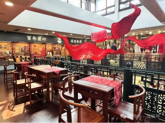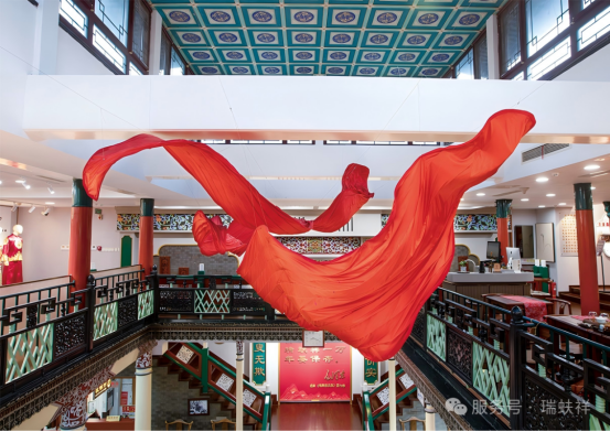 清末商業(yè)建筑的特色之處。頂部懸垂紅色綢藝裝置,致敬瑞蚨祥為新中國(guó)第一面五星紅旗提供面料的紅色記憶。
