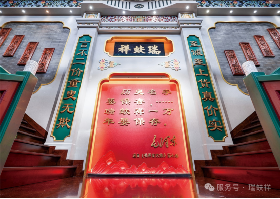 對(duì)稱雙梯典雅莊重,展壁上鐫刻1956年毛主席講話節(jié)選:“歷史名字要保存,瑞蚨祥……一萬(wàn)年要保存?!?/p>