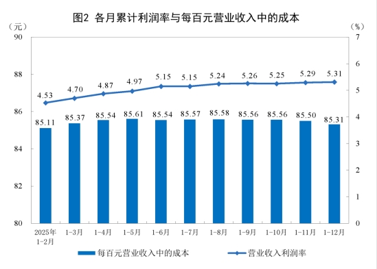 2025年,規(guī)模以上工業(yè)企業(yè)每百元營(yíng)業(yè)收入中的成本為85.31元,比上年增加0.16元;每百元營(yíng)業(yè)收入中的費(fèi)用為8.62元,比上年減少0.02元。