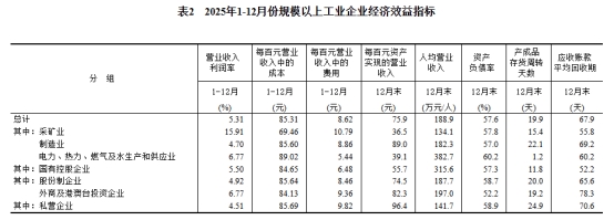 2025年末,規(guī)模以上工業(yè)企業(yè)每百元資產(chǎn)實(shí)現(xiàn)的營(yíng)業(yè)收入為75.9元,比上年末減少2.7元;人均營(yíng)業(yè)收入為188.9萬元,比上年末增加5.5萬元;產(chǎn)成品存貨周轉(zhuǎn)天數(shù)為19.9天,比上年末增加0.6天;應(yīng)收賬款平均回收期為67.9天,比上年末增加3.6天。