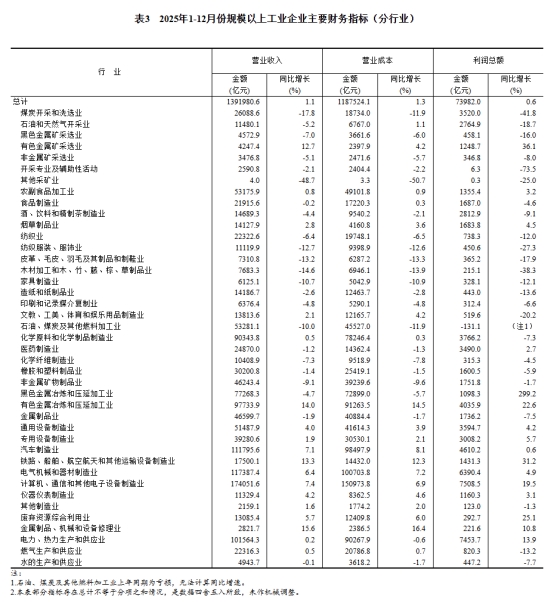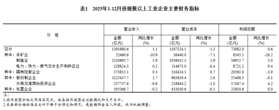 2025年,規(guī)模以上工業(yè)企業(yè)實(shí)現(xiàn)營(yíng)業(yè)收入139.20萬億元,比上年增長(zhǎng)1.1%;發(fā)生營(yíng)業(yè)成本118.75萬億元,增長(zhǎng)1.3%;營(yíng)業(yè)收入利潤(rùn)率為5.31%,比上年下降0.03個(gè)百分點(diǎn)。